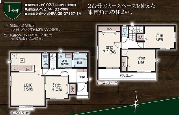 | 間取り | 92R 間取り内訳:リビングダイニングキッチン 15帖(1階)・洋室 4.5帖(1階)・洋室 6帖(2階)x2・洋室 7.1帖(2階) |