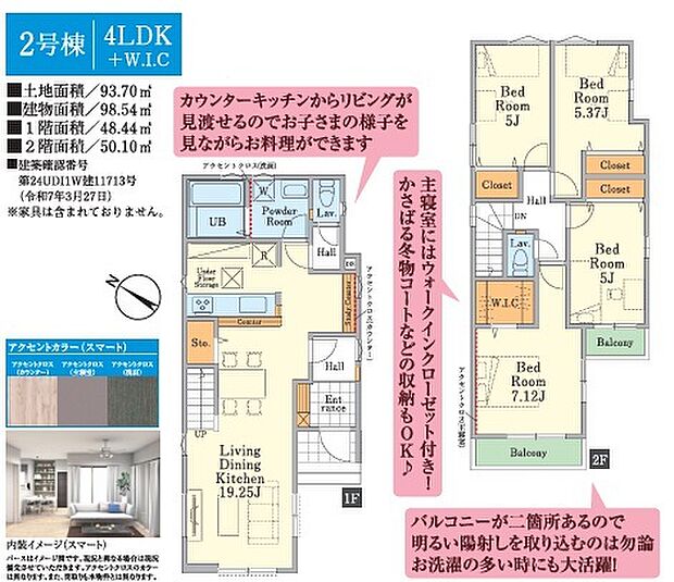 | 間取り | 3SLDK 間取り内訳:リビングダイニングキッチン 19.2帖(1階)・洋室 5帖(2階)x2・洋室 5.3帖(2階)・洋室 7.1帖(2階) |