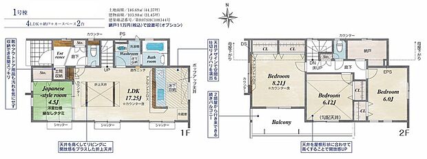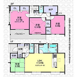 | 間取り | 4LDK 間取り内訳:リビングダイニングキッチン 17.2帖(1階)・和室 4.5畳(1階)・洋室 6帖(2階)・洋室 6.1帖(2階)・洋室 8.2帖(2階) |