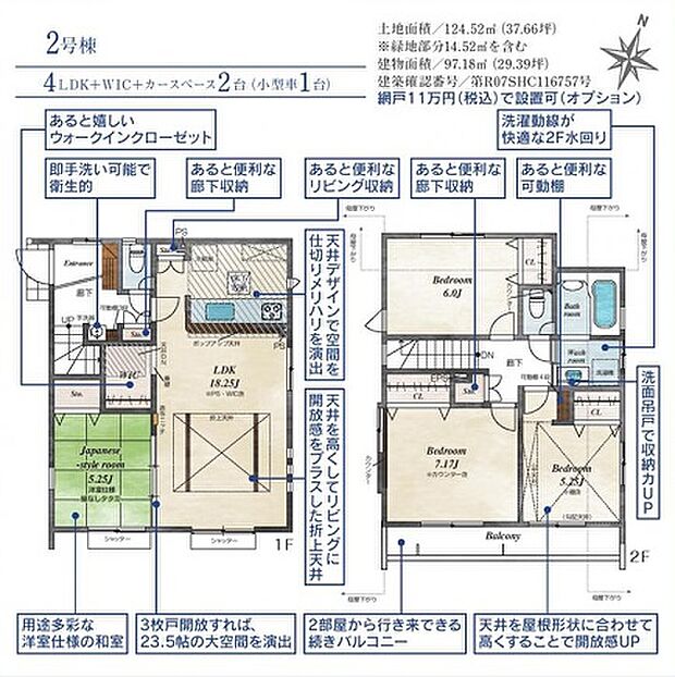 | 間取り | 4LDK 間取り内訳:リビングダイニングキッチン 18.2帖(1階)・和室 5.2畳(1階)・洋室 5.2帖(2階)・洋室 6帖(2階)・洋室 7.1帖(2階) |