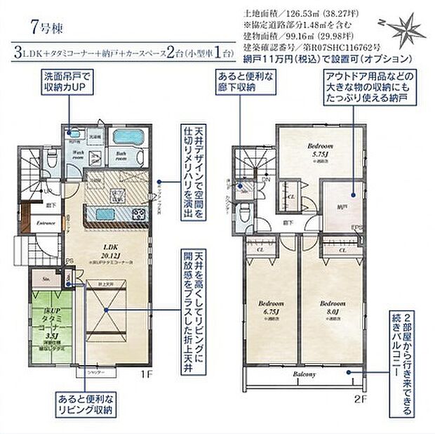 | 間取り | 3LDK 間取り内訳:洋室 8帖(2階)・リビングダイニングキッチン 20.1帖(1階)・その他 3.5帖(1階)・洋室 5.7帖(2階)・洋室 6.7帖(2階) |