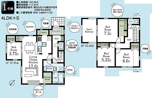 | 間取り | 4SLDK 間取り内訳:リビングダイニングキッチン 17帖(1階)・洋室 3.7帖(1階)・収納(1階)・洋室 5.3帖(2階)・洋室 6帖(2階)・洋室 7.5帖(2階) |
