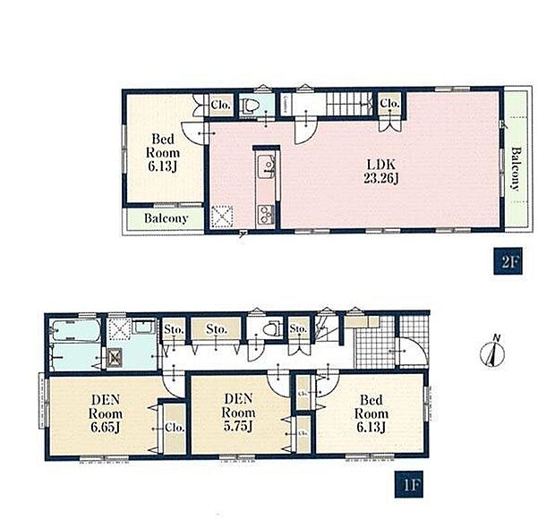 | 間取り | 2SLDK 間取り内訳:収納 6.6帖(1階)・収納 5.7帖(1階)・洋室 6.1帖(1階)・洋室 6.1帖(2階)・リビングダイニングキッチン 23.2帖(2階) |