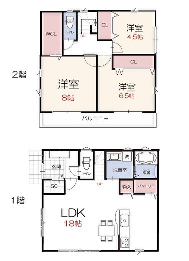 間取り内訳:リビングダイニングキッチン 18帖(1階)・洋室 4.5帖(2階)・洋室 6.5帖(2階)・洋室 8帖(2階)