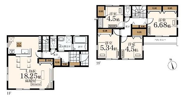 | 間取り | 4LDK 間取り内訳:リビングダイニングキッチン 18.2帖(1階)・洋室 4.5帖(2階)・洋室 5.3帖(2階)・洋室 4.5帖(2階)・洋室 6.6帖(2階) |