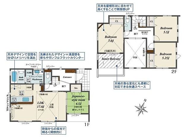 | 間取り | 4LDK 間取り内訳:洋室 5.5帖(2階)・リビングダイニングキッチン 17帖(1階)・和室 4.5畳(1階)・洋室 7帖(2階)・洋室 5.2帖(2階) |