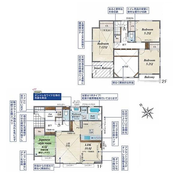 | 間取り | 4LDK 間取り内訳:リビングダイニングキッチン 18帖(1階)・和室 4.5畳(1階)・洋室 7.1帖(2階)・洋室 5.2帖(2階)・洋室 5.2帖(2階) |