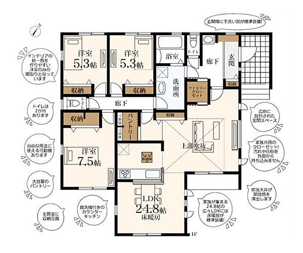 | 間取り | 3LDK 間取り内訳:リビングダイニングキッチン 24.8帖(1階)・洋室 5.3帖(1階)・洋室 5.3帖(1階)・洋室 7.5帖(1階) |