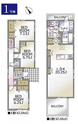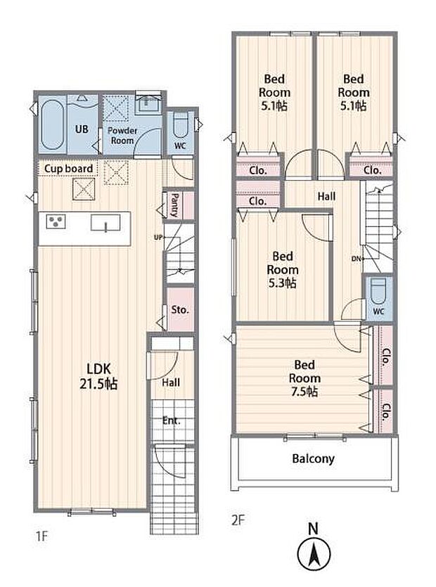 | 間取り | 4LDK 間取り内訳:リビングダイニングキッチン 21.5帖(1階)・洋室 5.1帖(2階)・洋室 5.1帖(2階)・洋室 5.3帖(2階)・洋室 7.5帖(2階) |