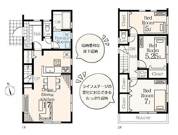 | 間取り | 3LDK 間取り内訳:リビングダイニングキッチン 17帖(1階)・洋室 5帖(2階)・洋室 5.2帖(2階)・洋室 7帖(2階) |