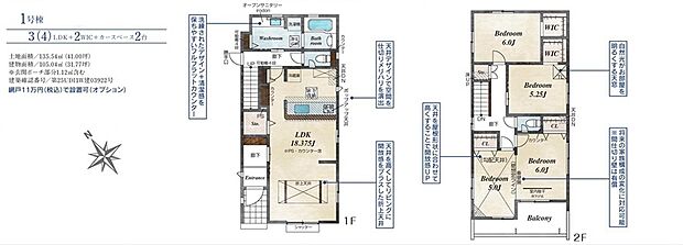 | 間取り | 3LDK(将来4LDKに対応可。) 間取り内訳:リビングダイニングキッチン 18.3帖(1階)・洋室 5.2帖(2階)・洋室 6帖(2階)・洋室 11帖(2階) |