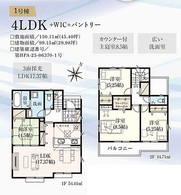 | 間取り | 4LDK 間取り内訳:リビングダイニングキッチン 17.3帖(1階)・和室 4.5畳(1階)・洋室 5.2帖(2階)x2・洋室 8.5帖(2階) |