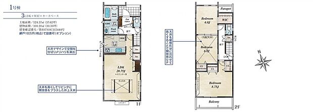 | 間取り | 3LDK 間取り内訳:リビングダイニングキッチン 20.7帖(1階)・洋室 6帖(2階)x2・洋室 8.7帖(2階) |