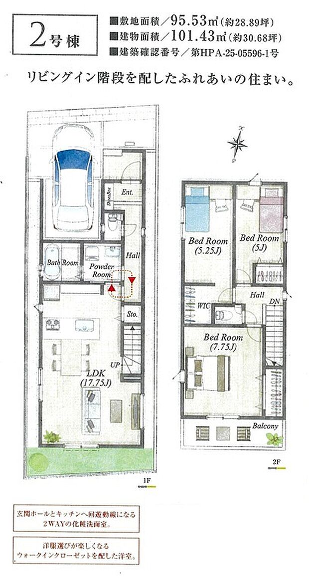| 間取り | 3LDK 間取り内訳:リビングダイニングキッチン 17.7帖(1階)・洋室 5帖(2階)・洋室 5.2帖(2階)・洋室 7.7帖(2階) |
