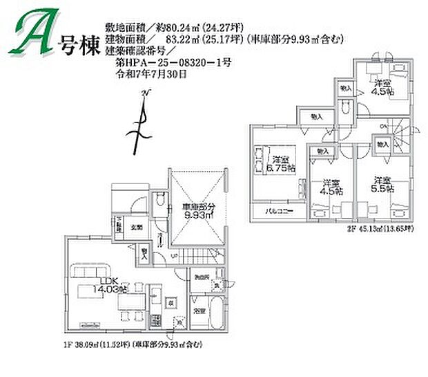 | 間取り | 4LDK 間取り内訳:リビングダイニングキッチン 14帖(1階)・洋室 4.5帖(2階)x2・洋室 5.5帖(2階)・洋室 6.7帖(2階) |