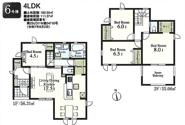 | 間取り | 4LDK 間取り内訳:リビングダイニングキッチン 17.5帖(1階)・洋室 4.5帖(1階)・洋室 6帖(2階)・洋室 6.5帖(2階)・洋室 8帖(2階) |