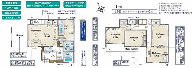 | 間取り | 3LDK(将来4LDKに対応可。) 間取り内訳:リビングダイニングキッチン 16.9帖(1階)・洋室 5帖(2階)・洋室 5.2帖(2階)・洋室 11.2帖(2階) |