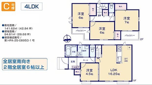 | 間取り | 4LDK 間取り内訳:リビングダイニングキッチン 16.2帖(1階)・洋室 4.5帖(1階)・洋室 6帖(2階)x2・洋室 7帖(2階) |