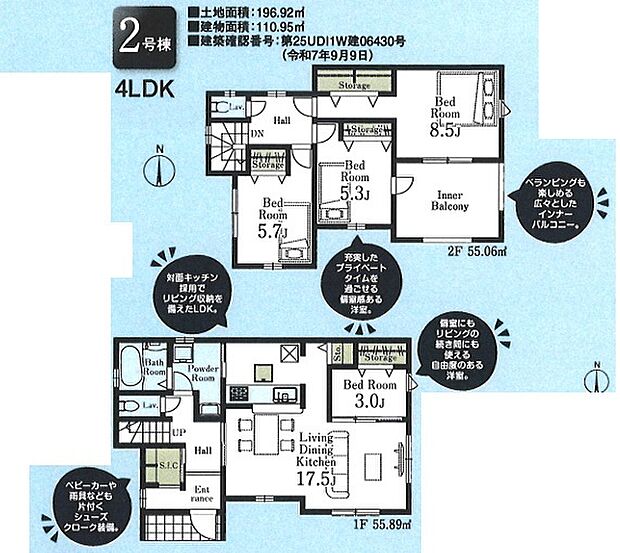 | 間取り | 4LDK 間取り内訳:リビングダイニングキッチン 17.5帖(1階)・洋室 3帖(1階)・洋室 5.3帖(2階)・洋室 5.7帖(2階)・洋室 8.5帖(2階) |