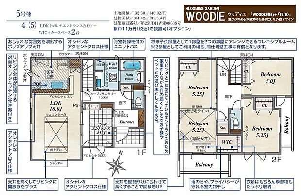 間取り内訳:リビングダイニングキッチン 16帖(1階)・洋室 5帖(2階)・洋室 5.2帖(2階)・洋室 10.5帖(2階)