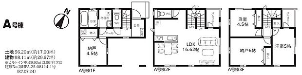 間取り内訳:収納 4.5帖(1階)・リビングダイニングキッチン 16.6帖(2階)・洋室 4.5帖(3階)・洋室 5帖(3階)・収納 6帖(3階)