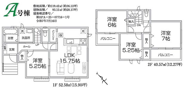 | 間取り | 4LDK 間取り内訳:リビングダイニングキッチン 15.7帖(1階)・洋室 5.2帖(1階)・洋室 5.2帖(2階)・洋室 6帖(2階)・洋室 7帖(2階) |