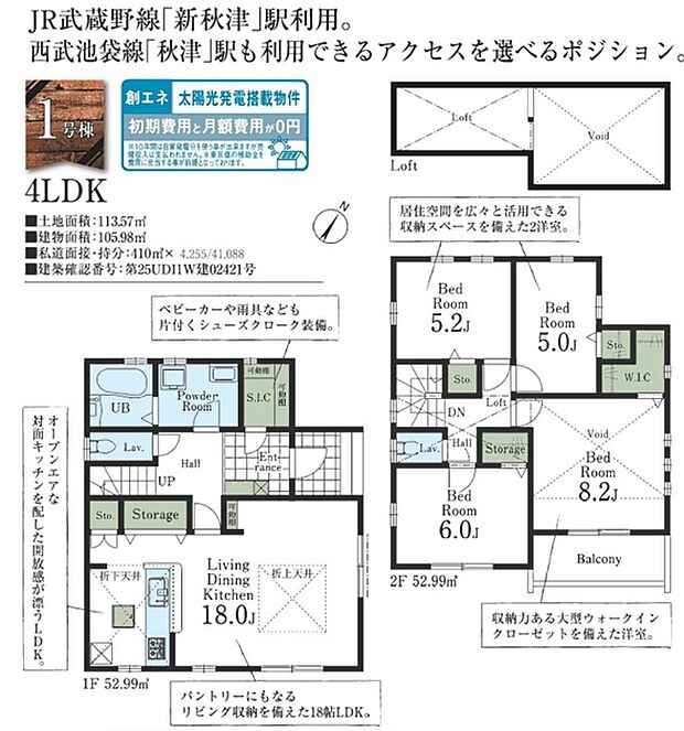 | 間取り | 4LDK 間取り内訳:リビングダイニングキッチン 18帖(1階)・洋室 5帖(2階)・洋室 5.2帖(2階)・洋室 6帖(2階)・洋室 8.2帖(2階) |