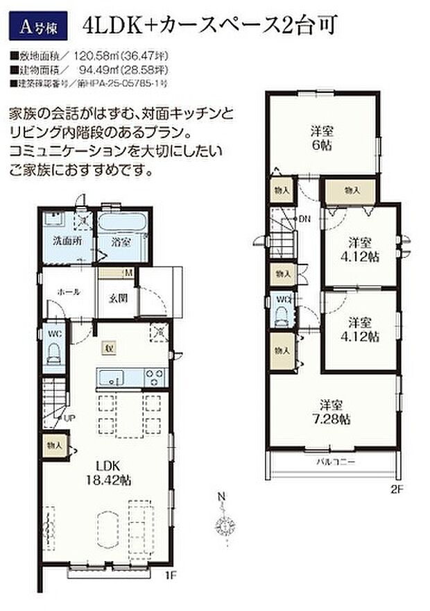 | 間取り | 4LDK 間取り内訳:リビングダイニングキッチン 18.4帖(1階)・洋室 4.1帖(2階)x2・洋室 6帖(2階)・洋室 7.2帖(2階) |