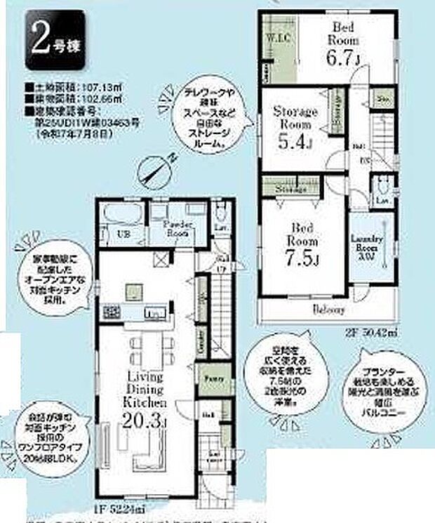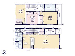 | 間取り | 2SLDK 間取り内訳:リビングダイニングキッチン 20.3帖(1階)・洋室 6.7帖(2階)・洋室 7.5帖(2階)・収納 5.4帖(2階) |
