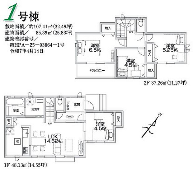 間取り内訳:リビングダイニングキッチン 14.6帖(1階)・洋室 4.5帖(1階)・洋室 4.5帖(2階)・洋室 5.2帖(2階)・洋室 6.5帖(2階)