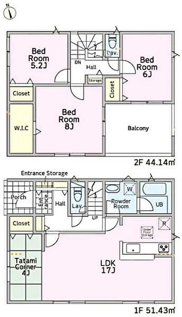 間取り内訳:リビングダイニングキッチン 17帖(1階)・和室 4畳(1階)・洋室 5.2帖(2階)・洋室 6帖(2階)・洋室 8帖(2階)
