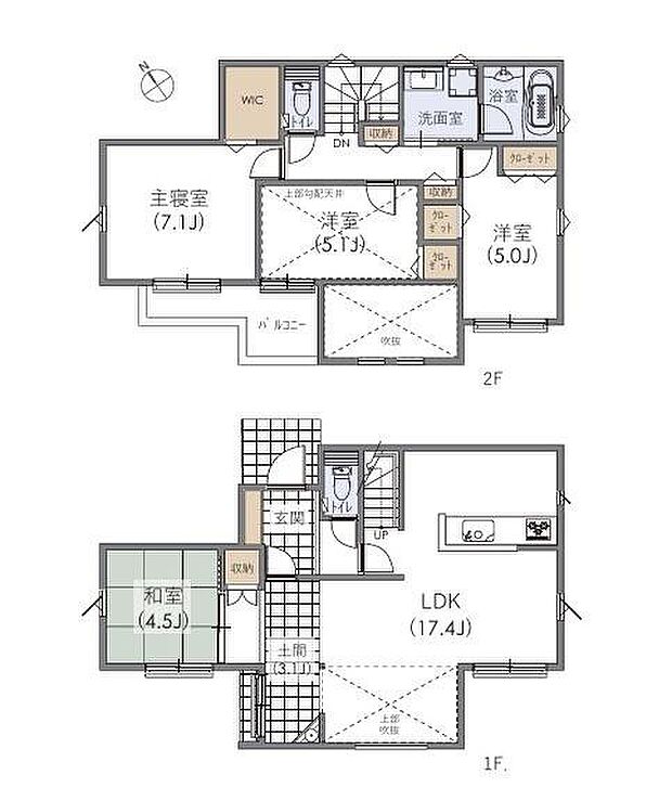 間取り内訳:リビングダイニングキッチン 17.4帖(1階)・和室 4.5畳(1階)・洋室 7.1帖(2階)・洋室 5.1帖(2階)・洋室 5帖(2階)