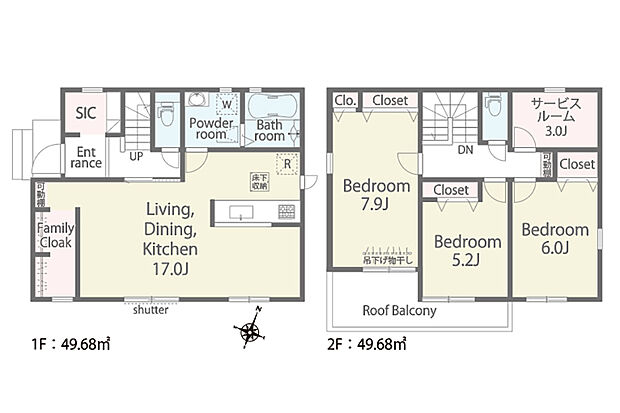 | 間取り | 3SLDK 間取り内訳:リビングダイニングキッチン 17帖(1階)・洋室 7.9帖(2階)・洋室 6帖(2階)・洋室 5.2帖(2階)・収納 3帖(2階) |