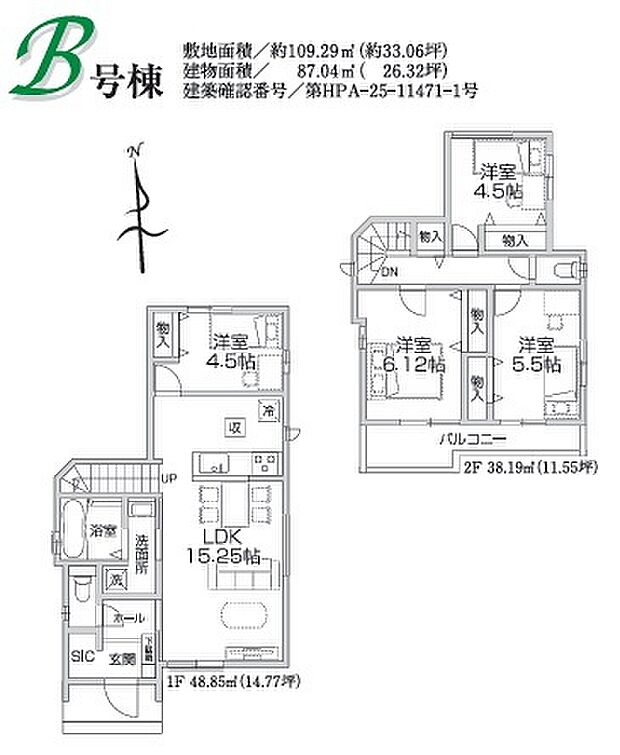 | 間取り | 3LDK 間取り内訳:リビングダイニングキッチン 15.2帖(1階)・洋室 4.5帖(2階)x2・洋室 5.5帖(2階)・洋室 6.1帖(2階) |