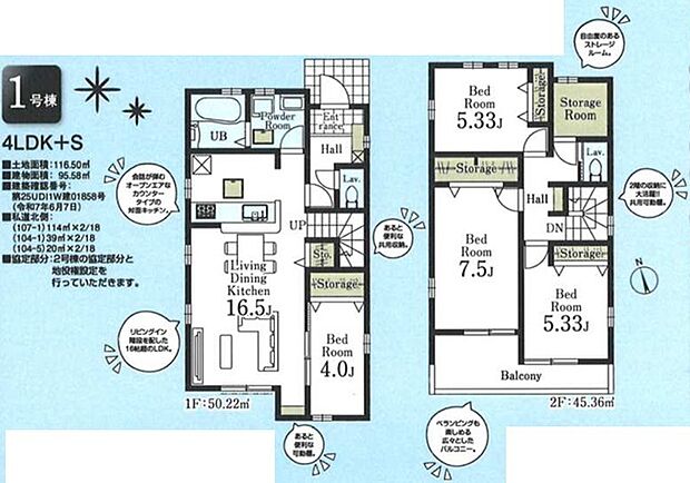 | 間取り | 4SLDK 間取り内訳:リビングダイニングキッチン 16.5帖(1階)・洋室 4帖(1階)・洋室 5.3帖(2階)x2・洋室 7.5帖(2階)・収納(2階) |