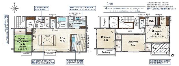 | 間取り | 4LDK 間取り内訳:リビングダイニングキッチン 18帖(1階)・和室 4.5畳(1階)・洋室 5.5帖(2階)・洋室 6帖(2階)・洋室 7.5帖(2階) |