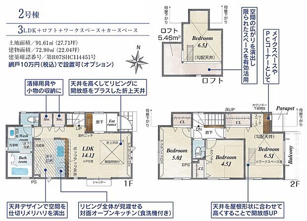 間取り内訳:リビングダイニングキッチン 14.1帖(1階)・洋室 4.5帖(2階)・洋室 5帖(2階)・洋室 6.5帖(2階)