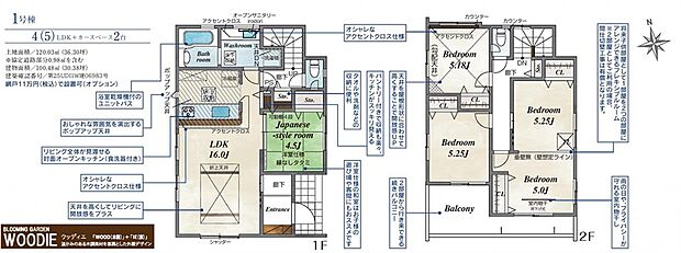 | 間取り | 4LDK(将来5LDKに対応可。) 間取り内訳:リビングダイニングキッチン 16帖(1階)・和室 4.5畳(1階)・洋室 5.1帖(2階)・洋室 5.2帖(2階)・洋室 10.2帖(2階) |