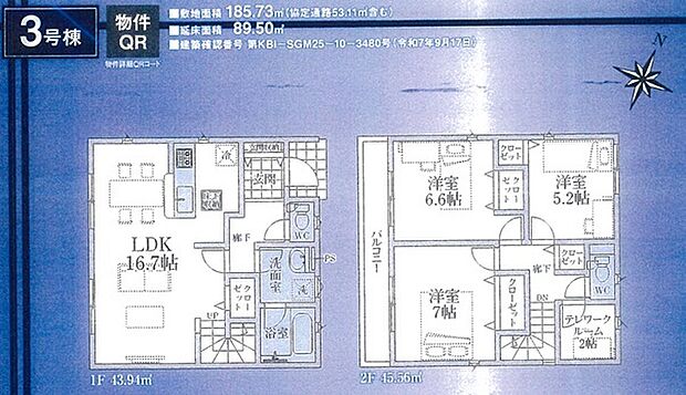 | 間取り | 3SLDK 間取り内訳:リビングダイニングキッチン 16.7帖(1階)・洋室 5.2帖(2階)・洋室 6.6帖(2階)・洋室 7帖(2階)・収納 2帖(2階) |