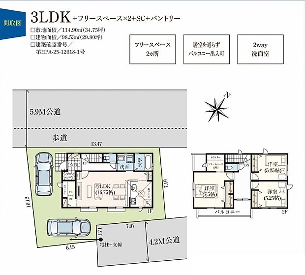 | 間取り | 3LDK 間取り内訳:リビングダイニングキッチン 16.7帖(1階)・洋室 5.2帖(2階)x2・洋室 7.5帖(2階) |