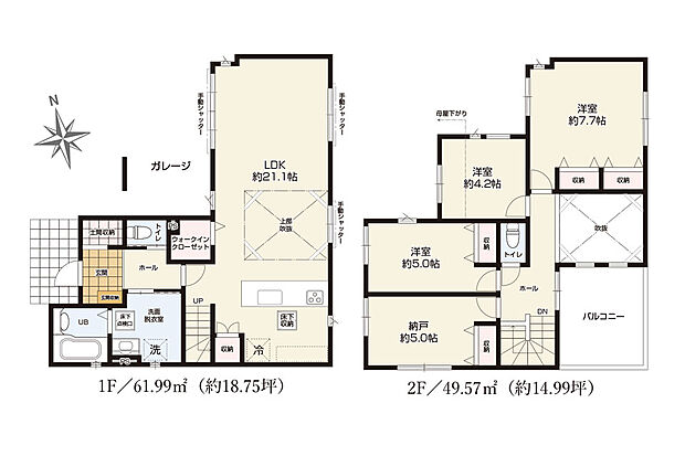 | 間取り | 3SLDK 間取り内訳:リビングダイニングキッチン 21.1帖(1階)・洋室 7.7帖(2階)・洋室 5帖(2階)x2・収納 4.2帖(2階) |