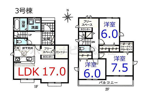 | 間取り | 3LDK(パントリーがあります。フリースペースが2個所あります。) 間取り内訳:リビングダイニングキッチン 17帖(1階)・洋室 7.5帖(2階)・洋室 6帖(2階)・洋室 6帖(2階) |