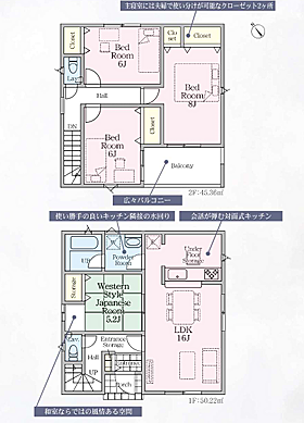 | 間取り | 4LDK 間取り内訳:リビングダイニングキッチン 16帖(1階)・和室 5.2畳(1階)・洋室 8帖(2階)・洋室 6帖(2階)x2 |