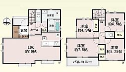 | 間取り | 4LDK(カーテン・照明・家具・家電等は付きません。住宅ローン借入にてご準備もできます。詳細はお問合せください) 間取り内訳:リビングダイニングキッチン 19帖(1階)・洋室 7.5帖(2階)・洋室 5.2帖(2階)・洋室 4.5帖(2階)x2 |