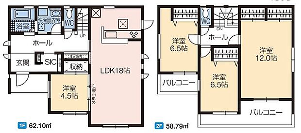 | 間取り | 4LDK 間取り内訳:洋室 4.5帖(1階)・リビングダイニングキッチン 18帖(1階)・洋室 12帖(2階)・洋室 6.5帖(2階)・洋室 6.5帖(2階) |