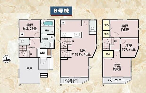 | 間取り | 2SLDK 間取り内訳:収納 3.7帖(1階)・リビングダイニングキッチン 15.4帖(2階)・洋室 6帖(3階)・洋室 3帖(3階)・収納 5帖(3階) |