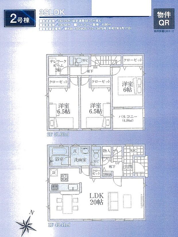 | 間取り | 3SLDK 間取り内訳:リビングダイニングキッチン 20帖(1階)・洋室 6帖(2階)・洋室 6.5帖(2階)x2・収納 2帖(2階) |