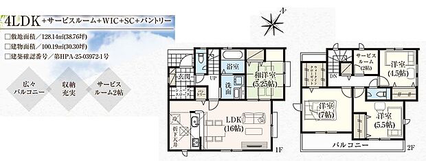 | 間取り | 4LDK 間取り内訳:リビングダイニングキッチン 16帖(1階)・和室 5.2畳(1階)・洋室 4.5帖(2階)・洋室 5.5帖(2階)・洋室 7帖(2階) |