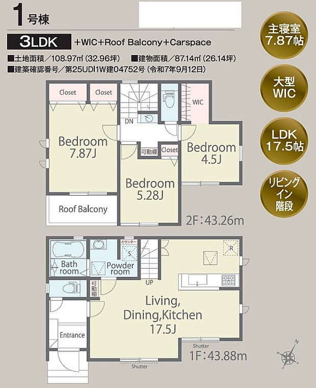 | 間取り | 3LDK 間取り内訳:リビングダイニングキッチン 17.5帖(1階)・洋室 4.5帖(2階)・洋室 5.2帖(2階)・洋室 7.8帖(2階) |