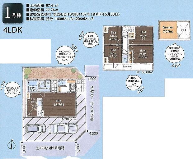 | 間取り | 4LDK 間取り内訳:リビングダイニングキッチン 15.7帖(1階)・洋室 4.1帖(2階)x2・洋室 5帖(2階)・洋室 5.3帖(2階) |